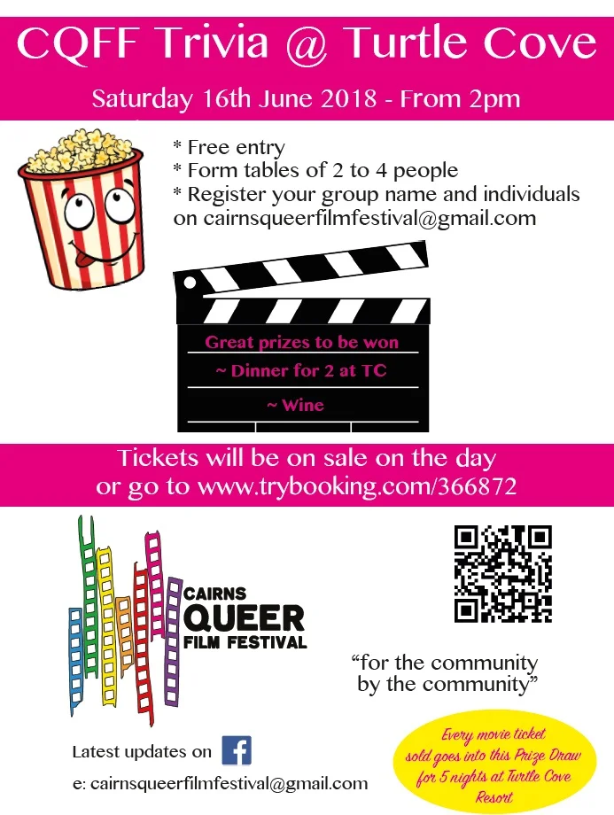 And for this coming LOCALS DAY we've invited the team from CAIRNS QUEER FILM FESTIVAL along to hold an After-Lunch Trivia fundraiser. So, cram your knowledge of Film Trivia and get set to join us for some fun and prizes, with your chance to win movie tickets and more!!